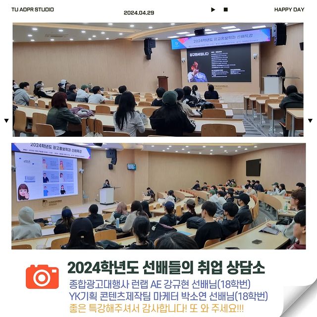 📣 2024년 <선배들의 취업 상담소> 현장(20240429), 후배들을 위해 귀한 걸음해주신 런랩 AE 강규현 선배님과 YK기획 마케터 박소연 선배님, 진심으로 감사드