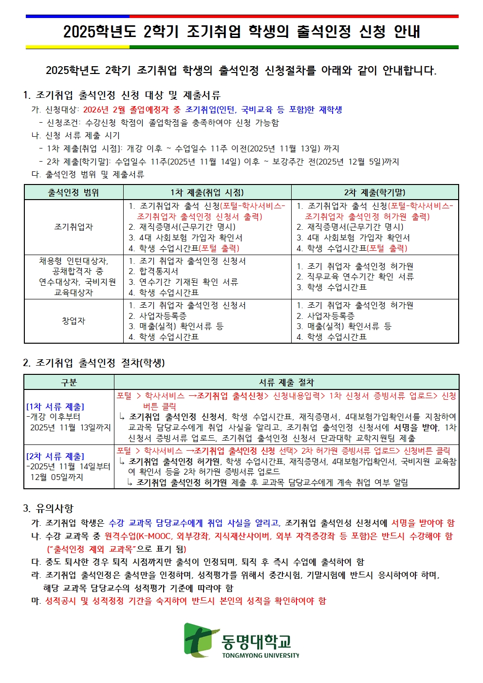 2025학년도 2학기 조기취업 학생 출석인정 신청 안내
