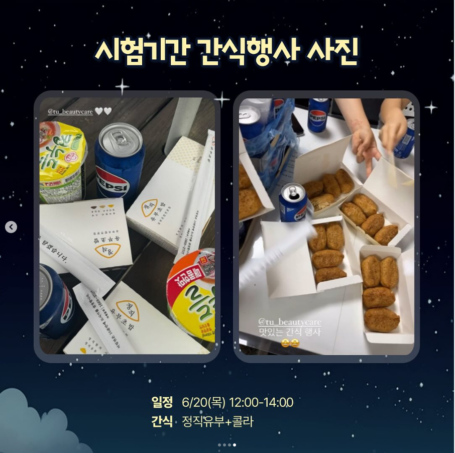 기말고사를 열심히 준비하는 학우 분들을 위해서 뷰티케어학과 학생회에서 기말고사 간식 증정 행사를 진행하였습니다!