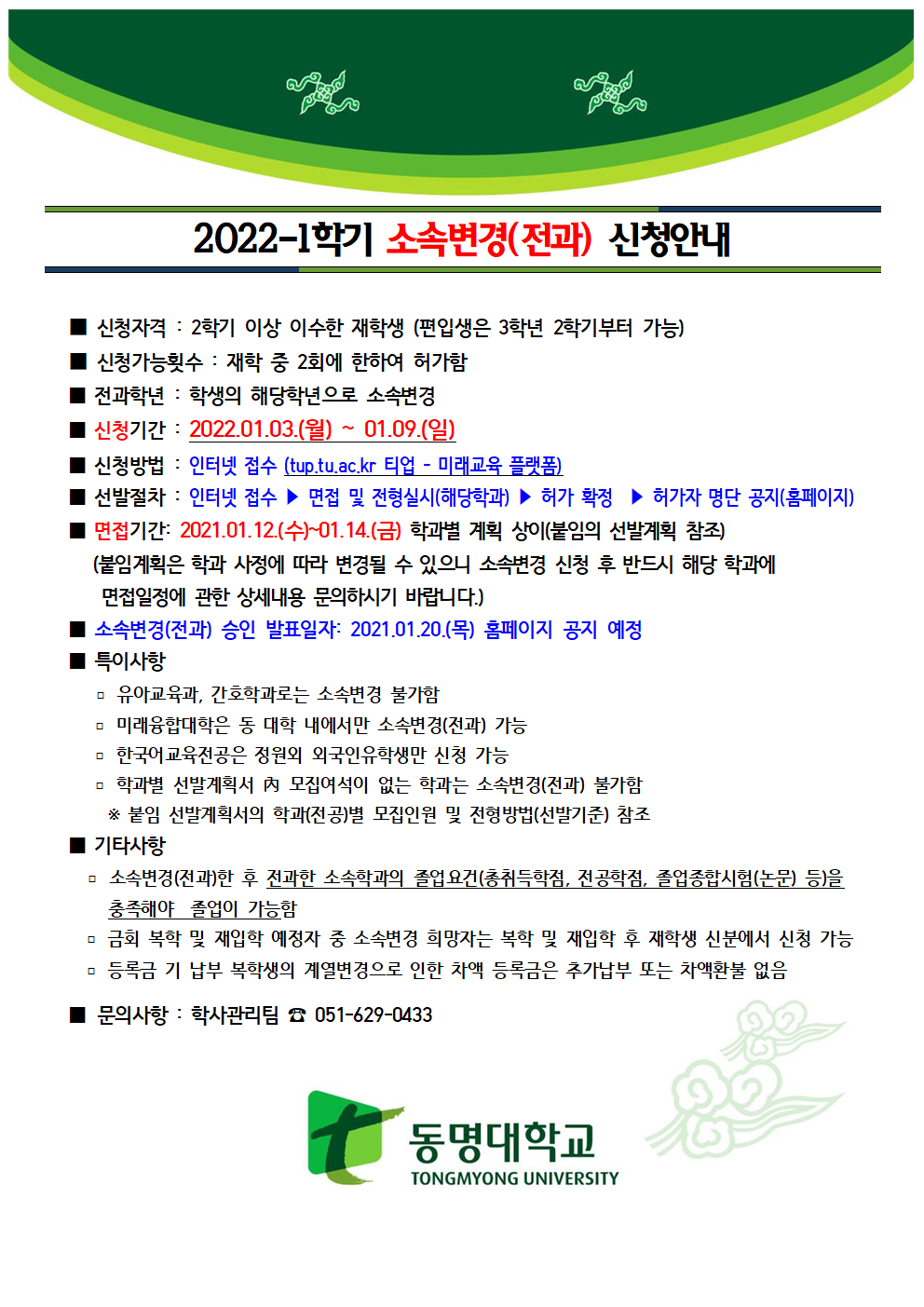 2022학년도 1학기 소속변경(전과) 신청 안내
