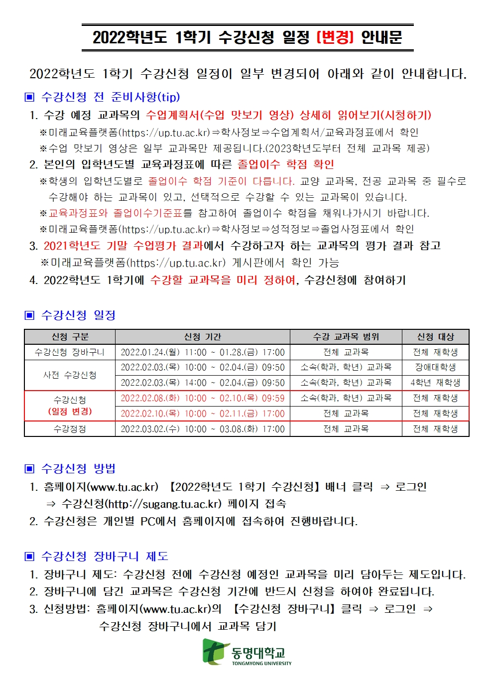 2022학년도 1학기 수강신청 일정을 아래와 같이 안내하오니 학사일정에 참고하시기 바랍니다.