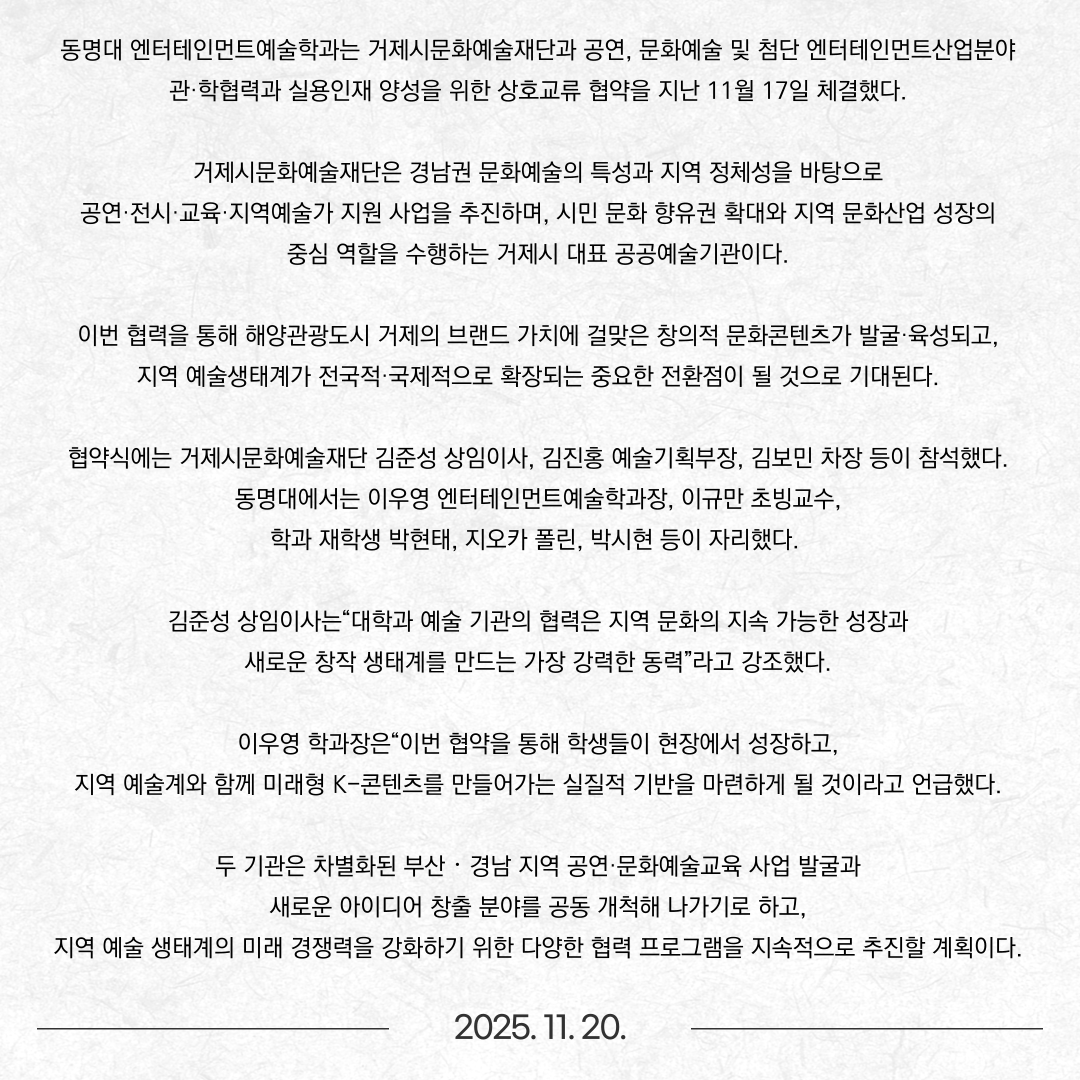 엔터테인먼트예술학과 거제시문화예술재단과 MOU