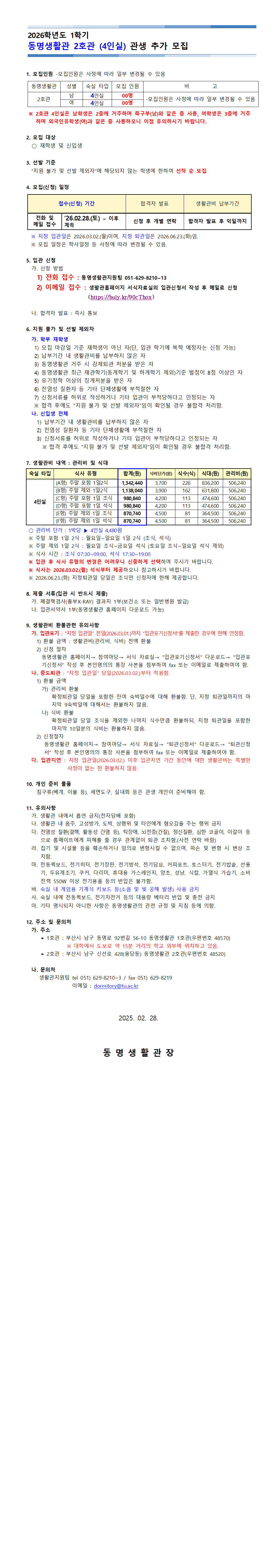 동명생활관 2호관(교내) 4인실 관생모집 안내