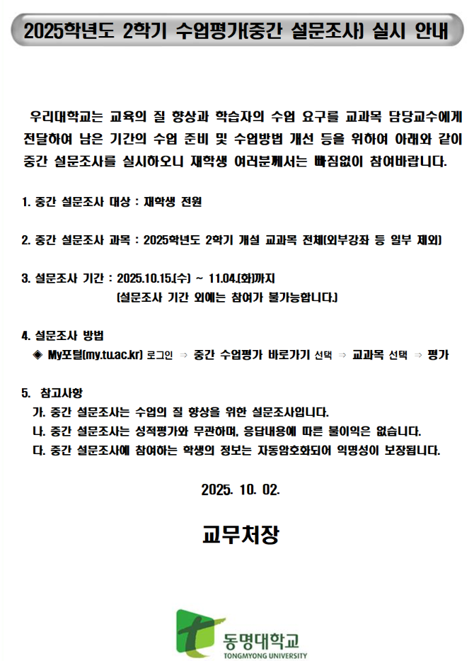 2025학년도 2학기 수업평가(중간 설문조사) 참여 안내