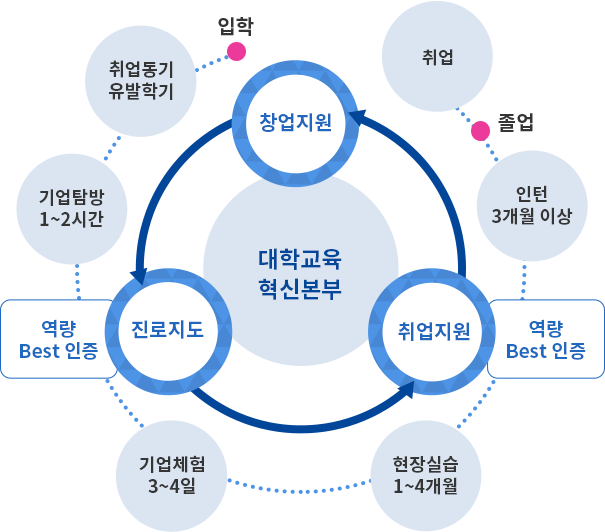 - 진로 / 취업상담 및 위·창업 정규 / 비교과 프로그램을 통한 현장체험형 전문인력 양성