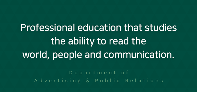 Advertising is an academic discipline that covers a wide range of social sciences, including communication, psychology, and business administration (marketing). The advertising and public relations department aims to "cultivate creative talent that can move people's minds." The Department of Advertising and Public Relations at Tongmyong University operates three detailed majors: online marketing communication, advertising, and PR, and provides theory-based, practical education programs to train experts in the field. To learn more about our department, please search for the advertising department on Tongmyong University's official YouTube or visit the department's official Facebook page at https://www.facebook.com/tuadpr