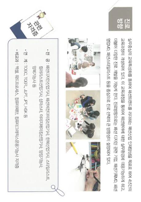 패션디자이너, 코디네이터, 웨딩 디자이너, 스타일리스트, 샵마스터, 패션 디렉터, 패션바이어, 패션코디네이션, 패션 컬럼 리스트, 액세서리 디자이너, 원단 커버터, 브랜드 매니저, VMD, 무대의상 디자이너, 텍스타일 디자이너, 텍스타일 커버터, 패턴사, 패션머천다이저, 패션컨설턴트, 중등학교 정교사 2급(교직), 일러스트레이터, 퍼스널쇼퍼 등 등