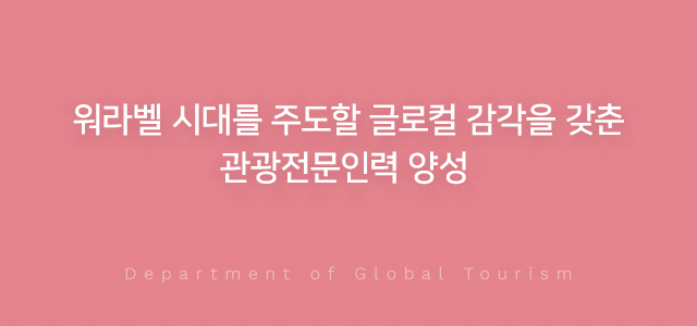 글로컬관광 전문가 양성을 위해 올바른 인성과 가치관, 어학능력을 바탕으로 변화하는 시대에 부응하는 지식은 물론, 업계 수요에 부응하는 교과, 현장과 연계된 실습, 산학연계 수업 등 이론과 실무를 겸비할 수 있는 교육 프로그램을 제공하고 있습니다. 아울러, 학과 전공 동아리, 더블 멘토링, 전공 자격증반, 각종 경진대회 등으로 글로컬 관광인으로서의 꿈과 즐거움을 제공하고 있습니다.