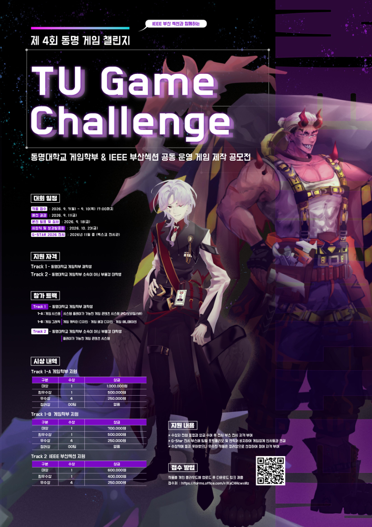 * TRACK 1(A, B)은 동명대학교 게임학부 재학생 전용이며, TRACK 2(IEEE 부산섹션 트랙)은 게임학부 외 부울경 지역 대학생에게 개방됩니다.