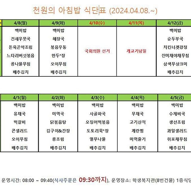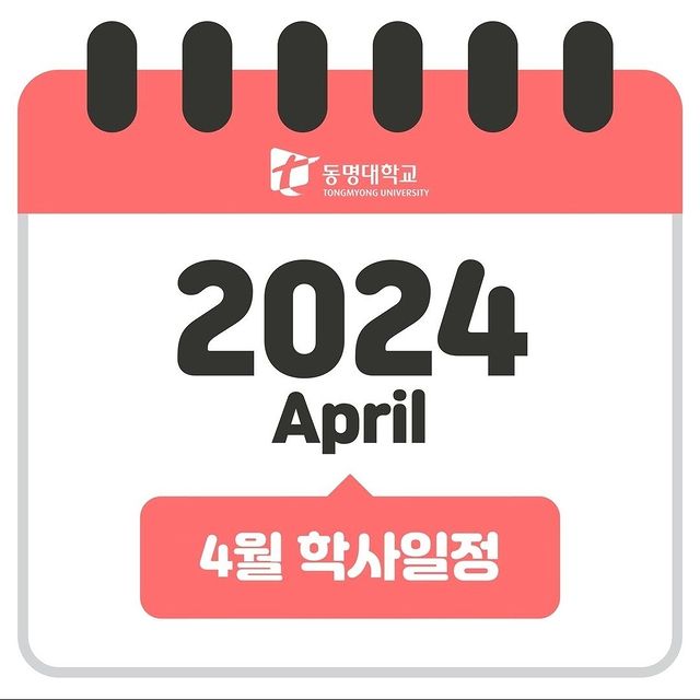 📅2024년 4월 학사일정📅 - 4.2.(화) : 수업일수 30일 - 4.10.(수) 22대 국회의원 선거 - 4.11.(목) 개교기념일 - 4.12.(금) 수업일수 1/3 - 4.22.(월) ~ 26.(금) : 중간시험 - 4.29.(월) : 수업일수 1/2