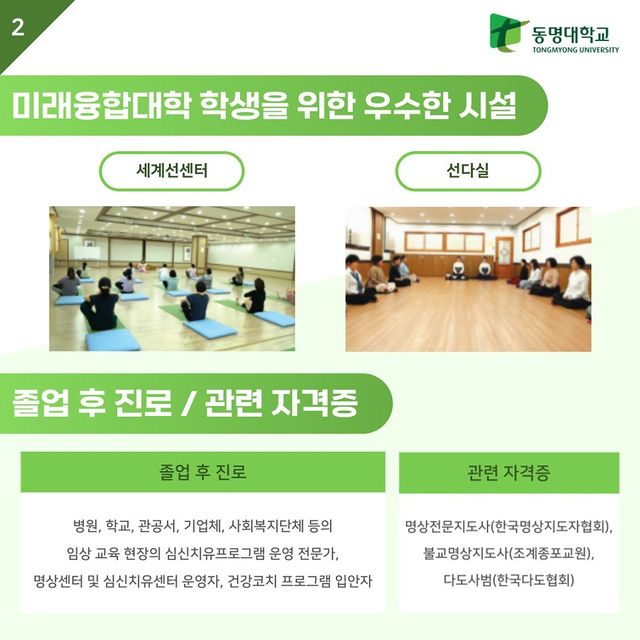 선명상치유학과에서는 졸업 후 병원, 학교, 관공서, 기업체, 사회복지단체 등의 임상 교육 현장의 심신치유프로그램 운영 전문가, 명상센터 및 심신치