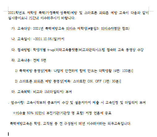 2021학년도 재학생 폭력(가정폭력·성폭력)예방 및 스마트폰 과의존 예방 교육이 다음과 같이 실시중이오니 기간내 이수해주시기 바랍니다.