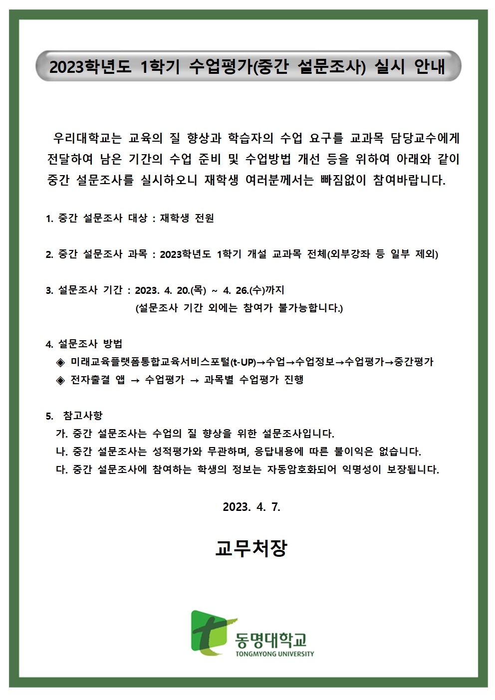 2023학년도 1학기 수업평가(중간 설문조사) 실시 안내