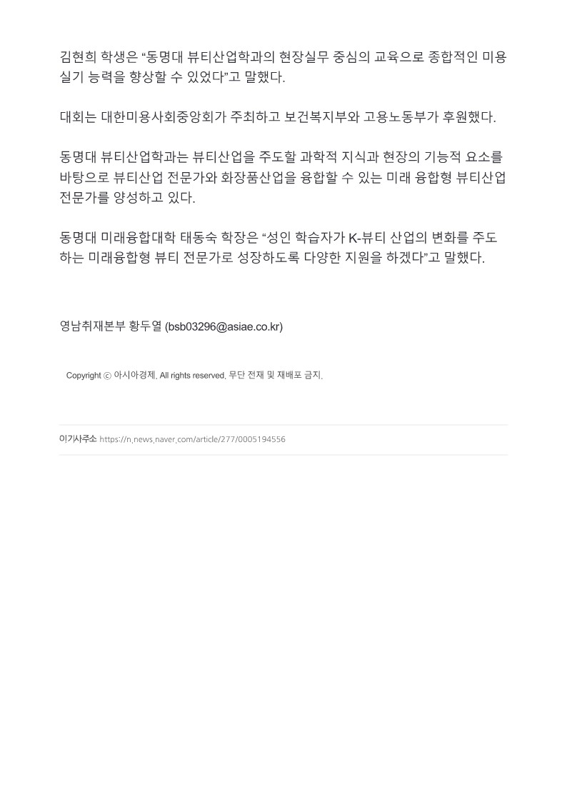 동명대 뷰티산업학과 재학생, 국제한국미용페스티벌 최우수상