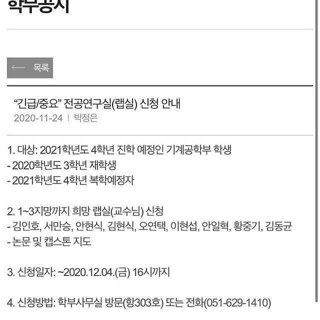 • 2025학년도 연구실 배정 신청 안내 2025학년도 연구실 배정 신청 안내 - 대상 : 2024학년도 3학년 재학생, 2025학년도 4학년 복학 예정 학생 - 희망 연구실 및 교수님 신청 : 오연택 교수님, 김현식 교수님, 김동균 교수님 - 신청기간 : 11.25(월) - 11.28(목) 17:00까지 ※ 기간내 미 신청자에 한하여 임의배정될 수 있으니 확인바랍니다. ※ 한 연구실에 인원이 과다하게 신청이 될 경우에 성적순으로 2,3지망으로 배정 될 수 있습니다. 기타 문의는 카카오톡이나 051-629-1410으로 연락 바랍니다. VIEW DETAIL