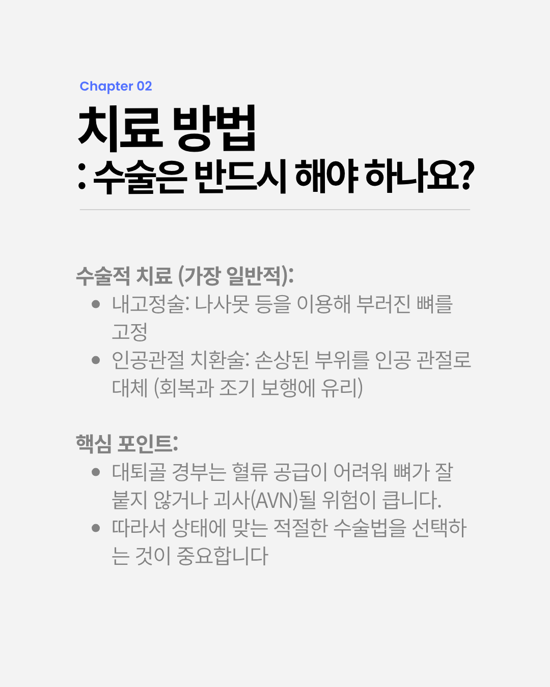 어르신들에게 ’낙상‘이 무서운 이유, 바로 대퇴골 경부 골절 때문입니다! 🦴골다공증이 있는 경우 살짝 엉덩방아를 찧는 것만으로도 발생할 수 있어 각별한 주의가 필요해요. 특히 대퇴골 경부는 혈류 공급이 원활하지 않아 뼈가 잘 붙지 않거나 무혈성 괴사(AVN) 같은 심각한 합병증이 생길 수 있습니다.수술 후에는 합병증 예방을 위해 조기에 움직이는 것이 무엇보다 중요합니다! 우리 부모님의 뼈 건강을 위해 오늘부터 칼슘 섭취와 근력 운동을 챙겨드리는 건 어떨까요? ✨#간호학과 #실습기록 #대퇴골경부골절 #고관절골절