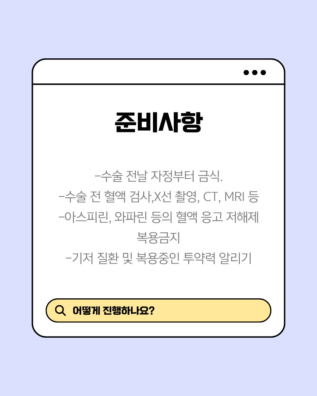 • 금식: 수술 전날 자정부터 반드시 금식해야 합니다.