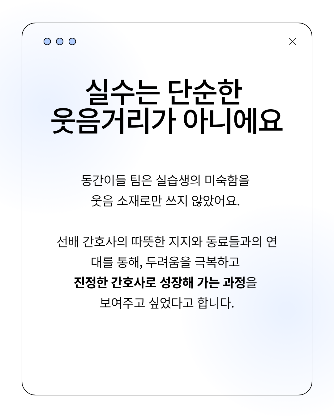 누구에게나 처음은 있다 🩺💙그리고 그 처음은… 생각보다 더 서툴고, 더 떨리고, 더 진짜다실수로 웃음만 주는 게 아니라그 안에 있는 두려움, 책임감, 그리고 성장까지 담아낸 이야기“잔뇨 주세요”에 “네? 담요요…?” 했던 그 순간처럼우리 모두 한 번쯤은 겪었을 ‘찐 현실’하지만 혼자가 아니라는 거선배와 동료가 있다는 거그게 결국 우리를 간호사로 만들어가는 과정인 것 같아👉 누구에게나 처음은 있고,그 처음은 결국 ‘성장’으로 이어진다동간이들의 공감 200% 숏폼 영상,지금 바로 확인해봐요 🎬#간호학과 #간호학생 #간호실습 #임상실습
