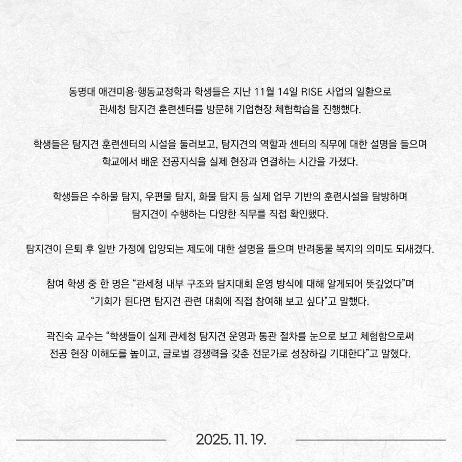 애견미용·행동교정학과 관세청 탐지견 훈련센터 기업현장학습