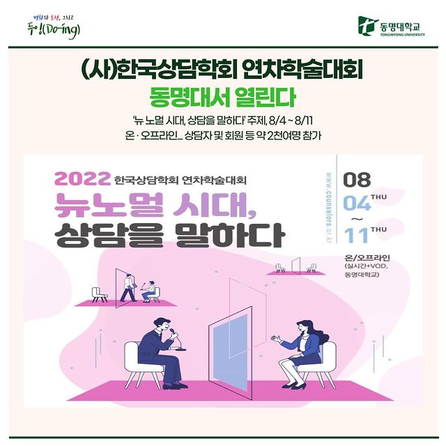 • 한국 상담학 발전의 중추적 역할을 맡고 있는 (사)한국상담학회(회장 김희수)의 2022년 연차학술대회가 오는 8월 4일(목) 오후 2시 동명대학교(총장 전호 인스타그램 2022-08-03